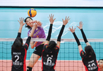 李盈莹(左二)在比赛中扣球(资料图)。新华社记者 赵子硕 摄