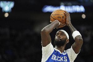 雄鹿球员波蒂斯上半场替补出战表现不错,尤其是三分线外百发百中。