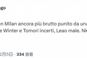 米兰跟队记者隆戈在社交媒体上写道:“一场糟糕的比赛,米兰表现更是糟糕,被更具求胜信念的拉齐奥惩罚。德温特和托莫里表现不稳,莱奥发挥不佳,至于恩昆库——看过比赛的人都会问,他到底在哪里?”