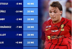 第一:雷特吉/胡拜尔库迪西亚,4000万欧元(-500万),前意甲金靴,意大利归化阿根廷的前锋,当打之年混沙特超。 第二:努涅斯/利雅得新月,3500万欧元(-1000万),前利物浦前锋。 第三:迪亚比/吉达联合,2800万欧(-200万),前阿斯顿维拉边锋。 并列第三:特奥/利雅得新月,2800万欧(-700万),前AC米兰边后卫。 并列第三:米洛/吉达国民,2800万欧(-700万),前斯图加特中场,年纪轻轻混沙特超。 第六:菲利克斯/利雅得胜利,2500万欧元(+500万),葡萄牙金靴五大联赛混不下,转战沙特超反而涨身价了。 并列第六:鲁本-内维斯/利雅得新月,2500万欧元(维持不变),葡萄牙国脚。 第八:罗杰-费尔南德斯/吉达联合,2200万欧元(维持不变),葡萄牙20岁新星。 并列第八:加来诺/吉达国民,2200万欧元(-200万),前波尔图前锋。 并列第八:科莫/利雅得胜利,2200万欧元(-800万),前拜仁边锋。