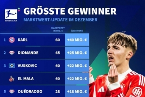 体育资讯12月19日讯 德国转会市场列出了德甲球员身价上涨排名,卡尔上涨4000万欧居首。