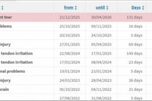 在2025/26赛季,遭遇感冒、小腿伤病和韧带撕裂,预计缺席152天,预计错过23场比赛。
