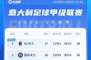 意甲积分榜:米兰先赛2分优势登顶!第2的国米1月5日将战博洛尼亚