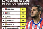 【里程碑】33岁的马竞中场科克为球队出战700次,成为西甲球队中第8位解锁“单队出场700次”的球员,他最终能够排到这个榜单的第几位?